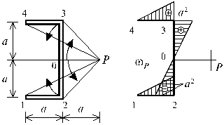 В качестве примера построим эпюру секториальной площади для контура, приведенного на рис.19.4, а. Выбираем в качестве полюса точку P, а за начало отсчета принимаем точку 0 (рис.19.4, а).