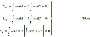 При стесненном кручении центр кручения, а также начало отсчета секториальной площади не могут быть выбраны произвольно. Эти точки должны быть выбраны так, чтобы секториально линейные моменты, а также секториально статический момент были равны нулю, т.е.: