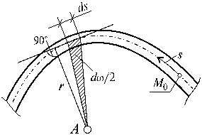 называется секториальной площадью. Таким образом, секториальная площадь представляет собой удвоенную площадь, очерчиваемую радиус-вектором РА при движении т. А по контуру от начала отсчета 0 до некоторого значения дуги s. Если радиус-вектор вращается по часовой стрелке, приращение площади dω имеет знак плюс, против часовой стрелки - минус.