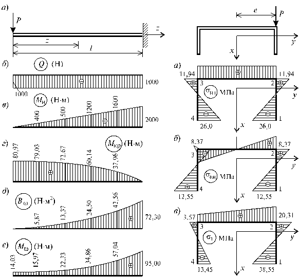 изгиба и стесненного кручения вычислим путем сложения эпюр
