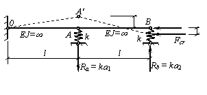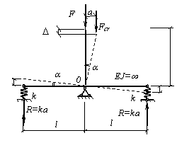 Решим поставленную задачу статическим методом при помощи уравнений равновесия для отклоненного состояния. Для этого рассмотрим систему, показанную на рисунке в отклоненном состоянии, т.е. после потери устойчивости. В отклоненном состоянии на упругих опорах возникнут опорные реакции Ra = ka1 и Rb = ka2, где k – жесткость упругих связей (пружин), равная силе, вызывающей единицу деформации упругой связи (пружины). Будем считать, что k – известная величина. Составим условие равновесия моментов относительно точки О: